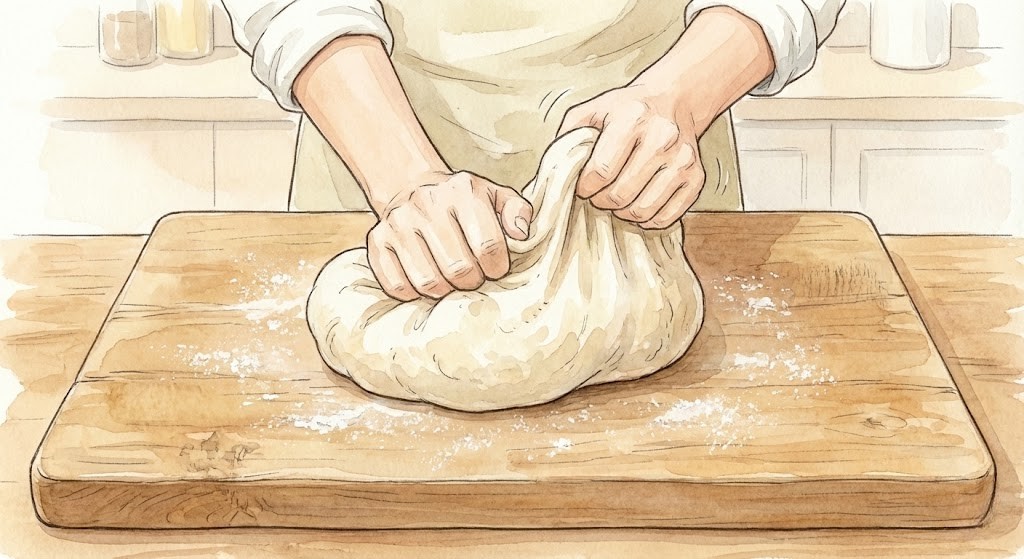 ただ材料を混ぜ合わせるだけでは、パンにはなりません。「こねる」という物理的な力を加えることで、小麦粉の中のタンパク質が結びつき、「グルテン」という網目状の膜が作られます。
