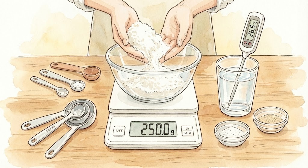 • ポイント: 必ず0.1g単位のスケールを使い、温度計で水温を測る。ここがズレると、この後の全てがズレます。