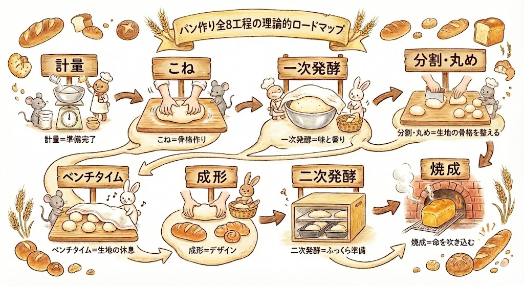 この基礎工程のロードマップを頭に入れて、これからのパン作りをより深く楽しんでくださいね!