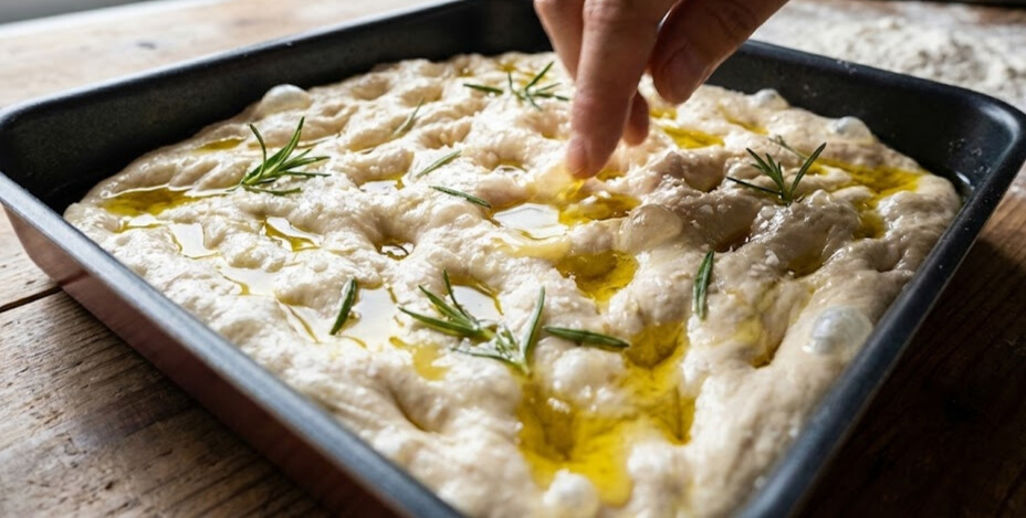 仕上げの儀式です✨ 生地全体にオリーブオイルと塩(お好みでローズマリーなど)を振りかけます。 ここで指を使って、生地にズボズボと穴を開けていきます(※ここが一番楽しい工程です!)。
