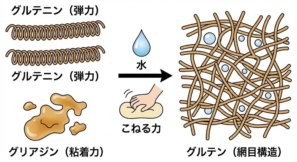 • グリアジン(粘着力): とりもちのような性質。「生地の伸び」や「つながる力」を作ります。これがないと生地がブチブチ切れてしまいます。