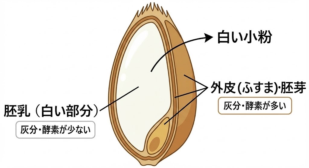 • 灰分が低い(真っ白な粉) = 精米された「白米」。雑味がなく、上品できれいな味。